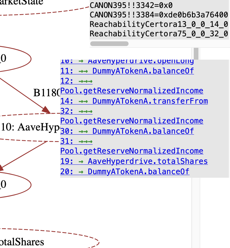 The figure above shows a TAC report that was generated from a Certora Prover run that timed out. Compared to the plain TAC report, additional information is available in three ways: